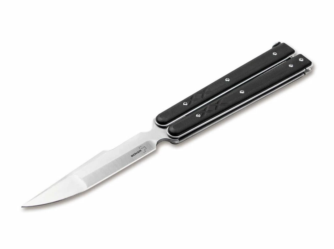 The Large Boker Plus Tactical Balisong is a smooth-gliding flipper that rides on bearings. It has a spring-loaded latch that, with a firm squeeze, will pop open to allow quick, one-handed blade deployment. The handles are made from textured G-10 with stainless steel liners that look and feel awesome. This is the large version.
