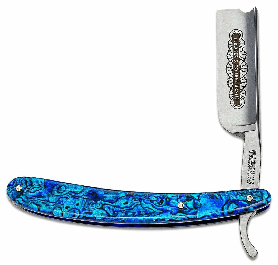 The so-called broadswords refer to particularly powerful razors and not only inspire confirmed lovers of the classic wet shave, but also us, again and again. The mighty 7/8 inch wide blade of this exceptional razor also carries a Barber’s Notch. Paua are crustaceans of the abalone genus, but unlike abalones, they are only found in the unspoiled nature of New Zealand’s coastal waters. They have been used by the Maori as traditional body ornaments for many centuries and are still used today as decorations for figures, weapons, and meeting houses. The impressive handle scales are absolutely unique in color and pattern. In addition to the extraordinary adhesion material, which is additionally provided with an ornamental rivet, the detailed blade laser engraving immediately catches the eye. A historical Boker etching, with which our razors were already decorated around 1900, served as a model. With authentic Boker stamp in the blade passage, certificate of authenticity, and historical packaging.