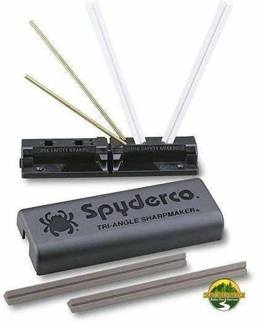 The key to sharpening any cutting tool is removing the steel at the edge while maintaining a consistent angle between the blade and the stone. Spydercoโs Tri-Angle Sharpmaker takes the mystery out of this process and enables anyone to sharpen a knife effectively with just a few minutesโ practice. Its durable ABS plastic base contains keyed holes that accurately set the stonesโ sharpening angles at a 30ยฐ (15ยฐ each side) or 40ยฐ (20ยฐ each side) for sharpening knives. Simply keep the plane of your knifeโs blade vertical and draw the edge along each stone to sharpen. Itโs that simple. For serrated blades, use the rounded edges of the stones and a slightly looser grip to allow the stone to flow into the recesses of each serration. The Sharpmaker system includes two sets of high alumina ceramic stones: a pair of medium-grit (brown) stones for aggressive sharpening and a set of fine (white) stones for professional-grade finishing. A set of brass safety rods protects your hands while sharpening and all components snap into the self-contained ABS plastic base and lid for easy storage. Every Sharpmaker comes complete with a detailed instruction book and DVD that guides you step by step through the process of sharpening knives, scissors, awls, and many other tools.
