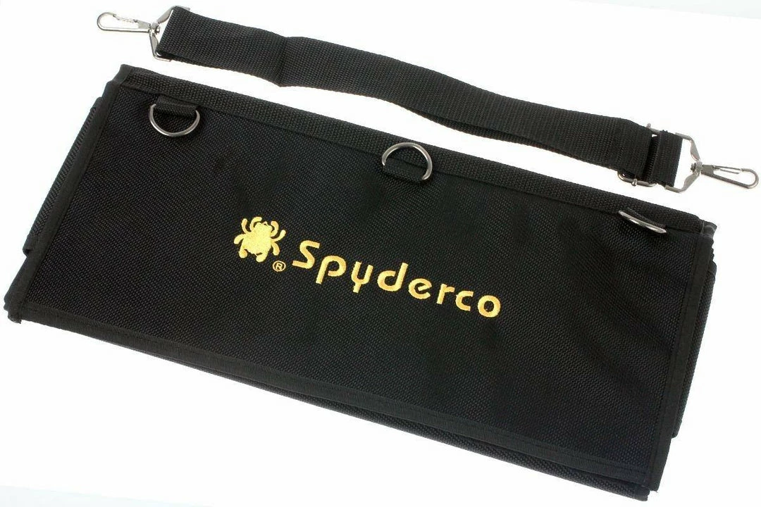 SpyderPac are the ultimate solution for storing, protecting and transporting your collection of folding knives. Made from tough black polyester denier, these durable multi-pocket packs have clear plastic viewing pockets that hold knives securely in place without marring or scratching. Multiple Velcro closures, an adjustable shoulder strap and an embroidered gold Spyderco logo complete the package and make the SpyderPac an indispensable accessory for every serious knife enthusiast.