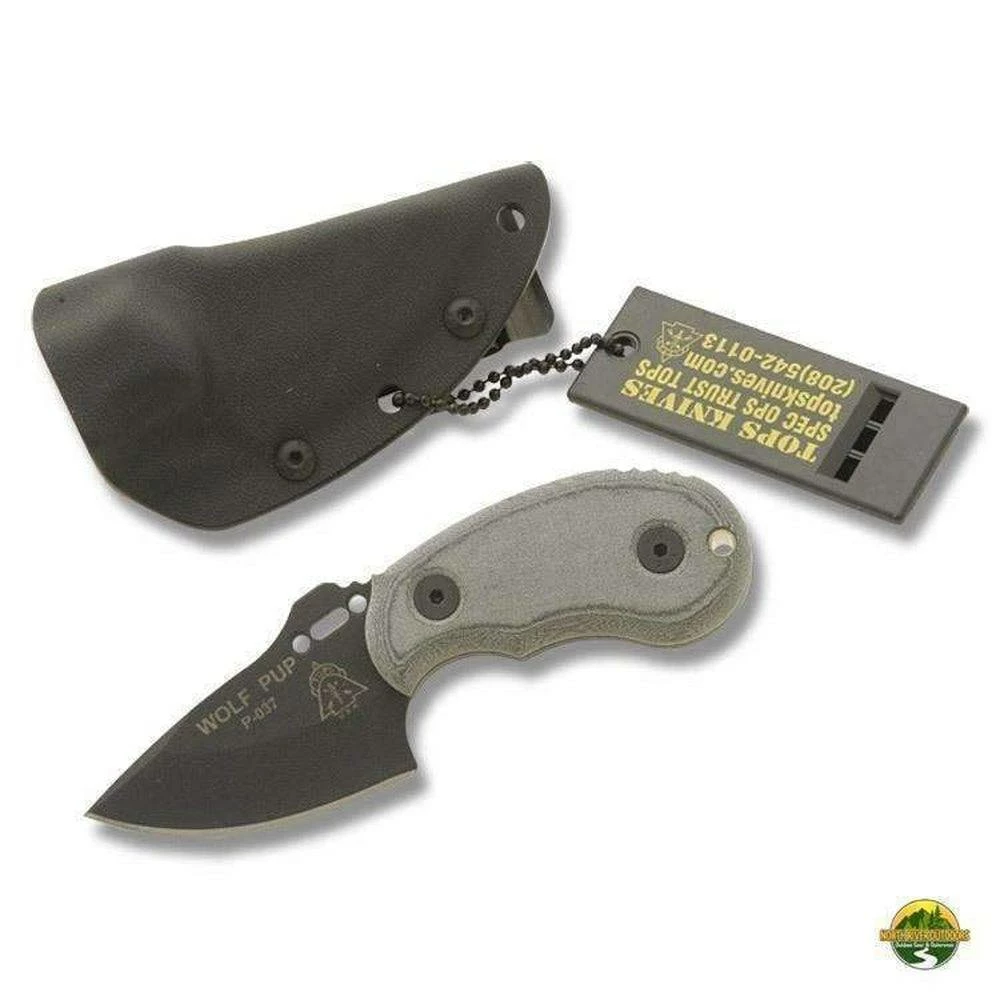 Discount ✔️ TOPS KNIVES All Knife Brands TOPS Wolf Pup Black 1095 Carbon Blade Linen Micarta Handles ⌛