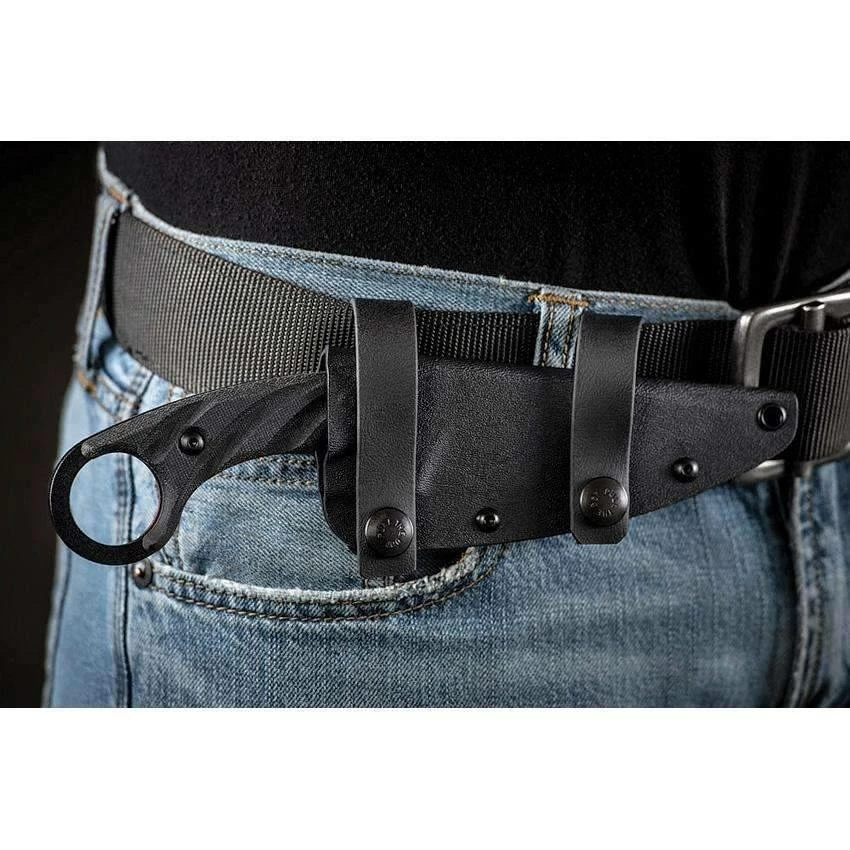 It is a combative, ring-knife with a utility style blade for field use. The curved handle and ring of a karambit provide superior comfort during combative use, and a traditional drop point blade profile is ideal in the field. The aggressive tip provides for maximum penetration during combat, allowing the C.U.T. 4.0 to penetrate body armor and heavy clothing much easier while also being useful for drilling chores during fieldcraft tasks.
