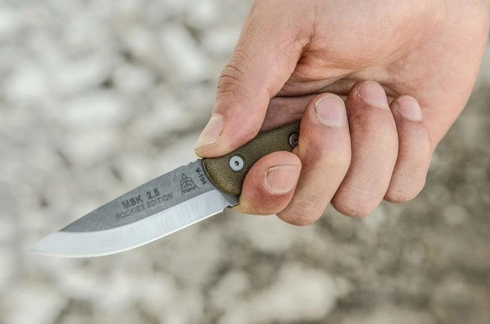 The Mini Scandi Knife has resonated well with thousands of outdoorsmen, survivalists, and bushcrafters because of its intuitive and useful design. Everything about it is great. The MSK Rockies Edition ditches the powder coat for a tumble finish with clear Cerakote for rust prevention, green canvas Micarta handles, and a tan Kydex sheath. Still the same great neck knife, now with yet another option.