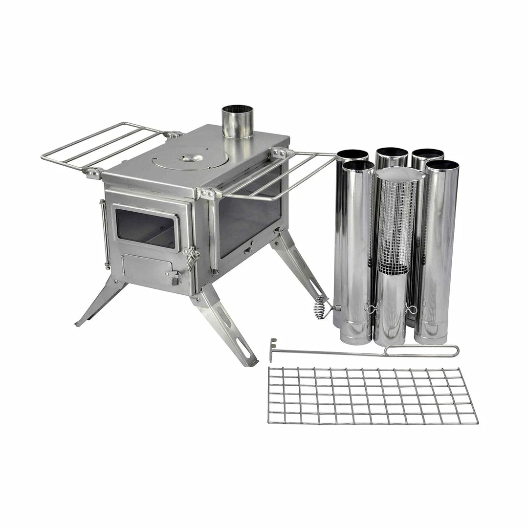 - Highly portable- Nesting legs and shelves fold flat to the stove body; 5 pipe sections, spark arrestor, and an ash scraper stow inside the stove body