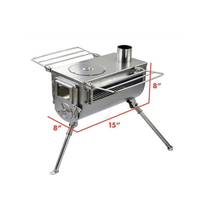 Now with a total of three viewing windows (1 door, 2 side), the Winnerwell Double-View Large Wood Burning Tent Stove provides an efficient heating and cooking solution with stunning ambience when in operation. Ideal for use in compatible canvas tents, the Woodlander also works well in recreational shelters such as teepees, bell tents, and even tiny homes and vans when properly installed. Made entirely in 304 stainless steel that is highly corrosion resistant and durable with decorative twisted metal handles.